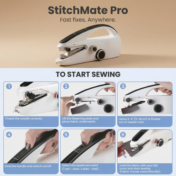 No sewing table required. Use this handheld sewing tool to mend jacket tears or car seat rips in minutes. Portable design fits a glove box or backpack so fixes happen now, not later, keeping plans on track and saving costly dry-clean or upholstery trips.